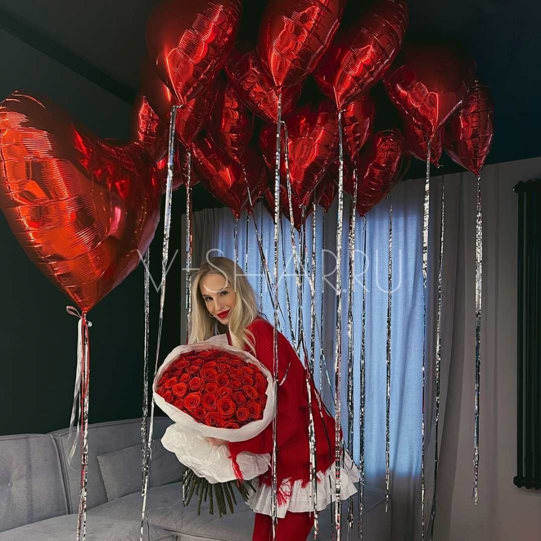 - 20 фольгированных красных сердец 45 см на серебряном дожде