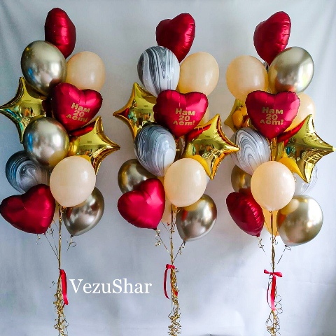 - 5 фольгированных шаров 45 см (2 звезды золото, 3 сердца красных сатин + 1 надпись до 4 слов)