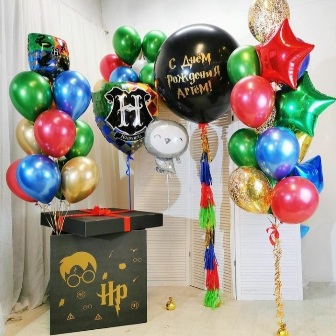- Первый фонтан: 10 латексных хром 30 см , квадрат Гарри Поттер;