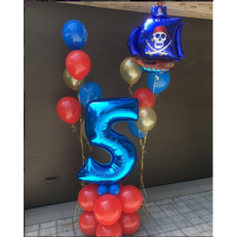 Композиция из воздушных шаров с цифрой на стойке и двумя фонтанами из шаров на грузиках