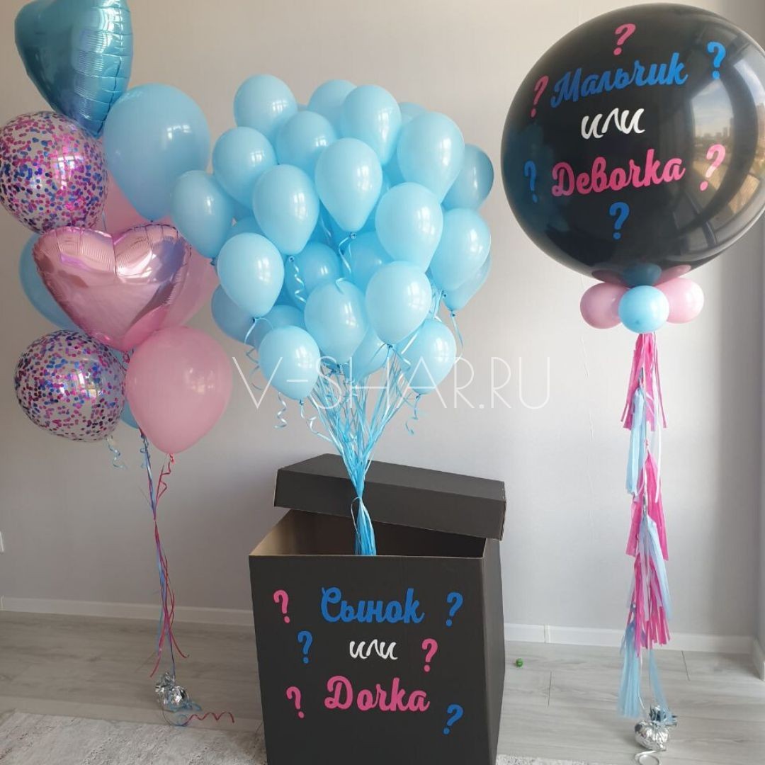 - гендерный шар 65-70 см с гирляндой и наполнением (перья, шары и конфетти)