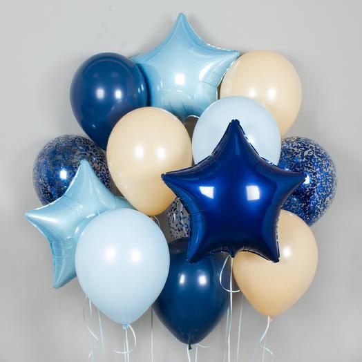 - 7 латексных шаров (2 голубой макарун, 2 темно синих пастель, 3 персик макарун )