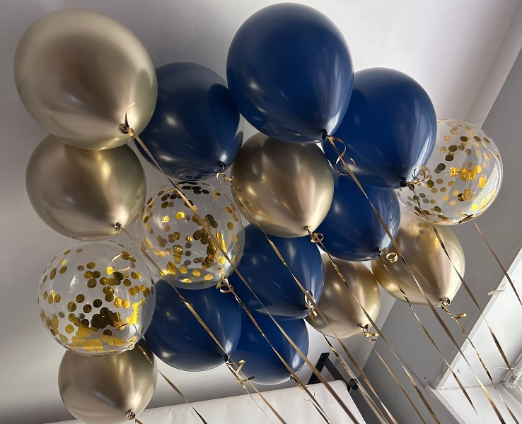 - 15 латексных шаров 30-35 см (3 с конфетти большой круг золото, 6 хром золото glossy gold, 6 темно-синий пастель Sempertex)
