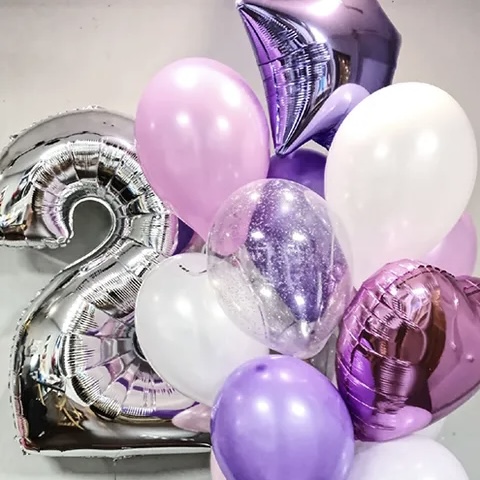 - фонтан из 9 шаров (1 звезда сиреневая; 1 сердце розовое; 1 с конфетти серебро; 2 сиреневый пастель lavender; 3 белый металл; 2 розовый металл)