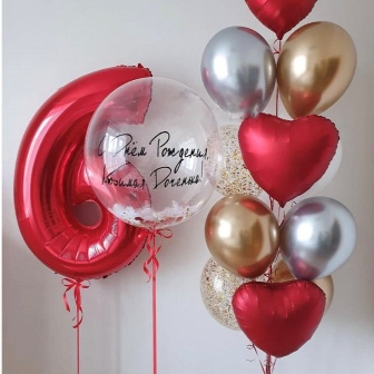 - фонтан из 13 шаров (3 хром золото glossy gold, 3 белый пастель, 2 с конфетти куб золото, 2 хром серебро, 3 сердца красный сатин)