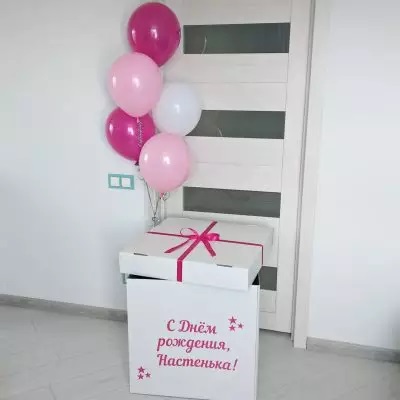 Коробка сюрприз с индивидуальной надписью и воздушными шарами внутри.