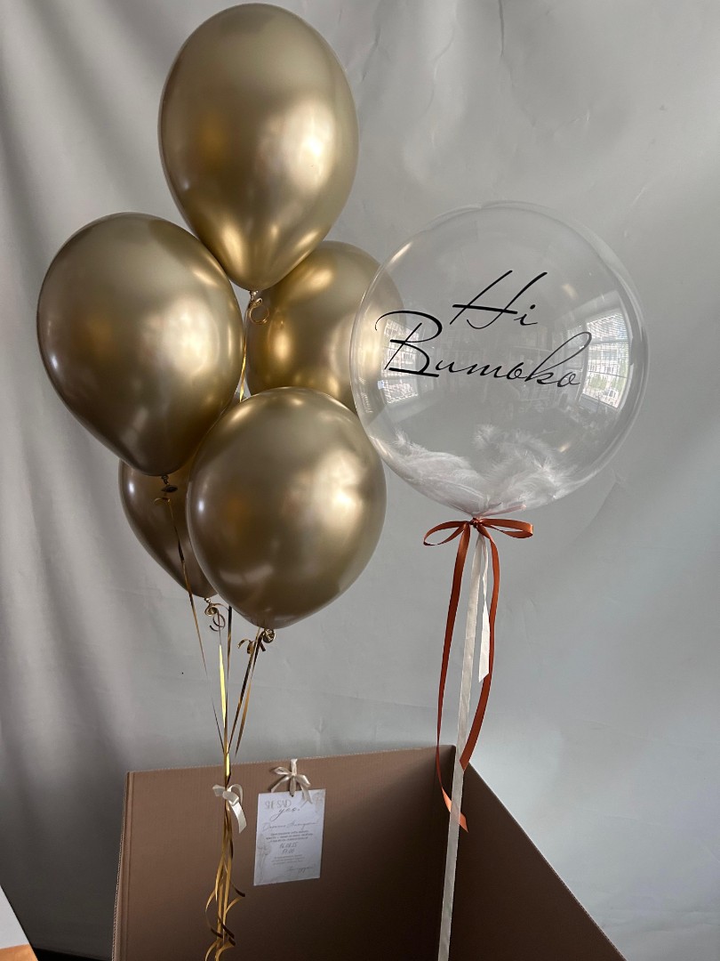 - большой прозрачный шар с перьями и индивидуальной надписью 45-55 см;