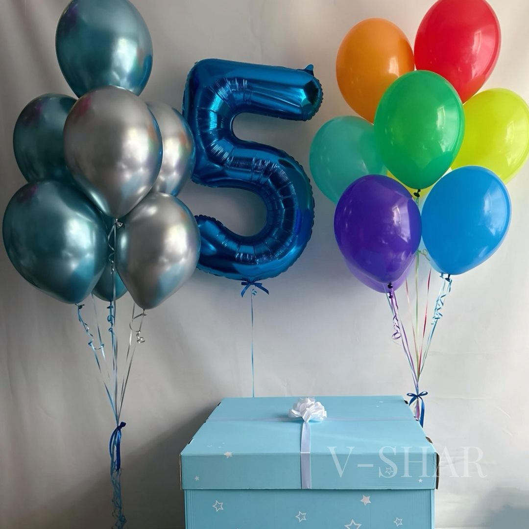 Коробка-сюрприз с 10 шарами с гелием, рядом цифра и фонтан из 7 шаров.