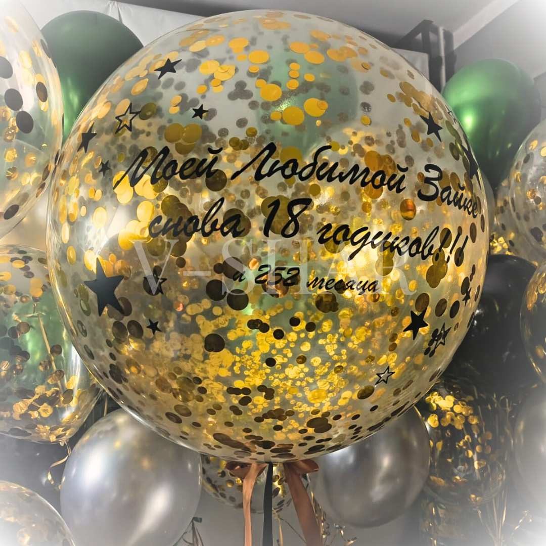 Шар латексный кристалл с конфетти золото с гелием и индивидуальной надписью.