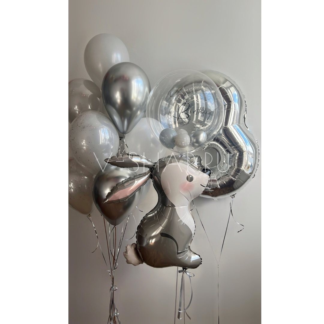 - 10 латексных шаров 30-35 см (3 серебро хром, 3 белый пастель, 2 двойной белый с конфетти в кристалле, 2 двойной серый макарунс с конфетти в кристалле)