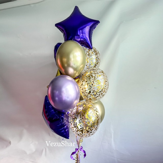 - 3 фольгированных шара 45 см (2 фиолетовых звезды, 1 золотая звезда) ;