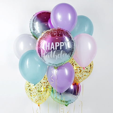 - 8 латексных шаров 30-35 см (2 с конфетти куб золото, 2 лаванда пастель, 1 розовый макарун, 1 лаванда макарун, 2 мятный пастель)