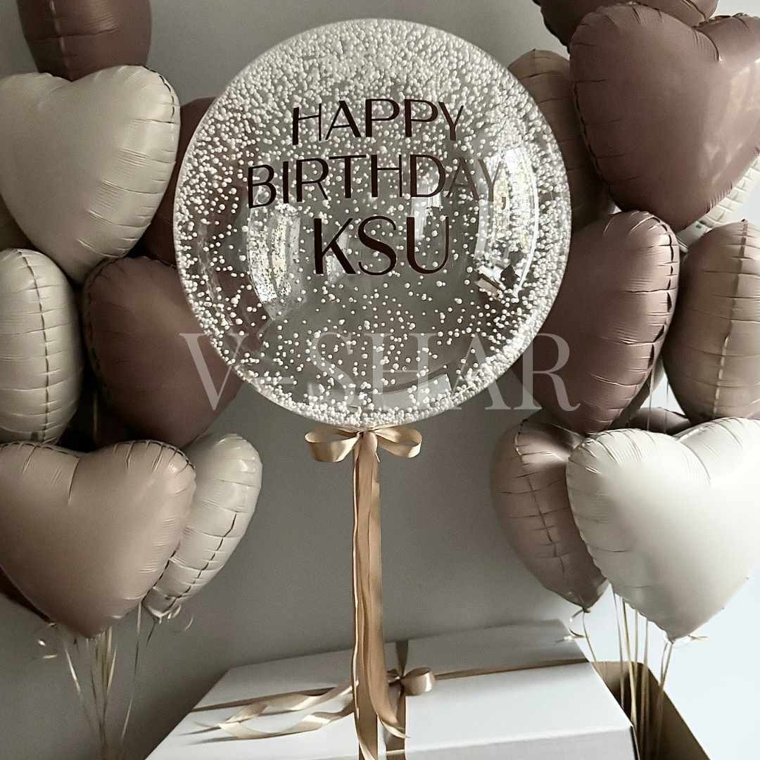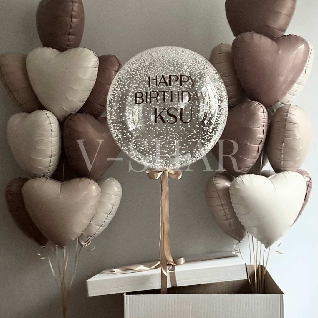 - 20 фольгированных сердец 45 см (в оттенках латте, крем и пудра) рядом с коробкой