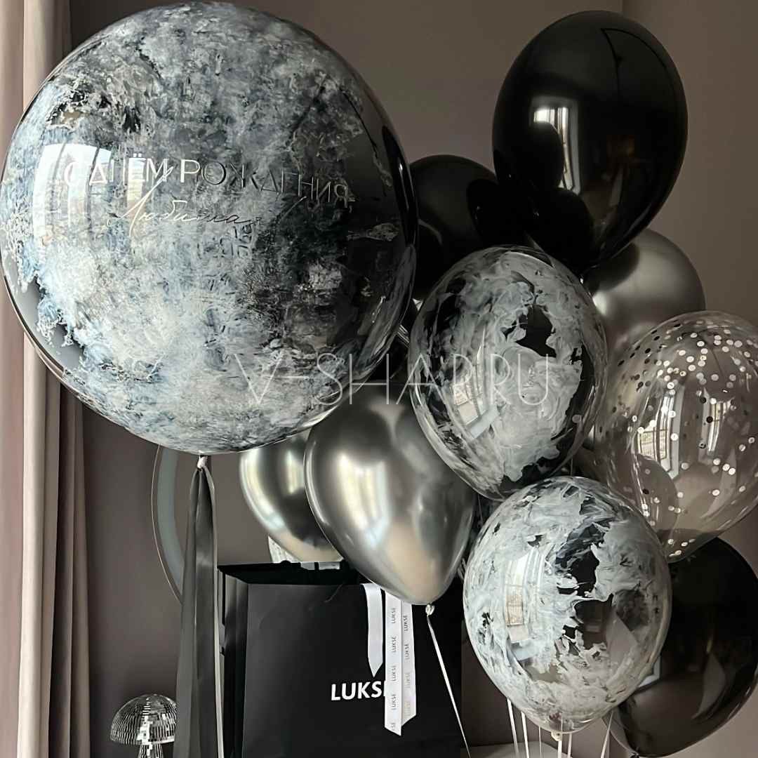 - 7 латексных шаров 30-35 см (2 хром серебро, 3 черный пастель, 1 с конф серебро круг, 3 дабл черный в клисталле с краской)