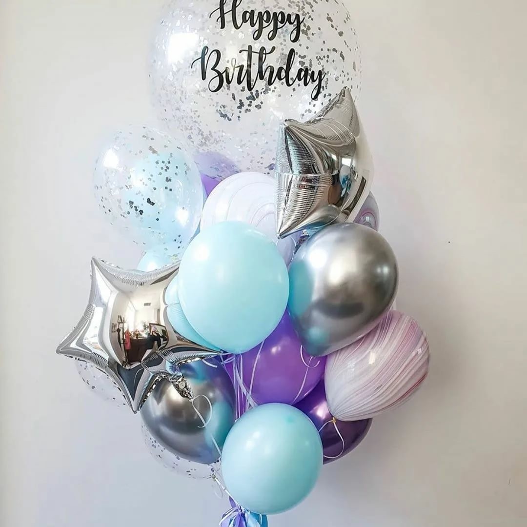 Большой набор: 20 воздушных шаров и сверху большой шар 60 см с блестками и надписью, пушно собраный на грузик.