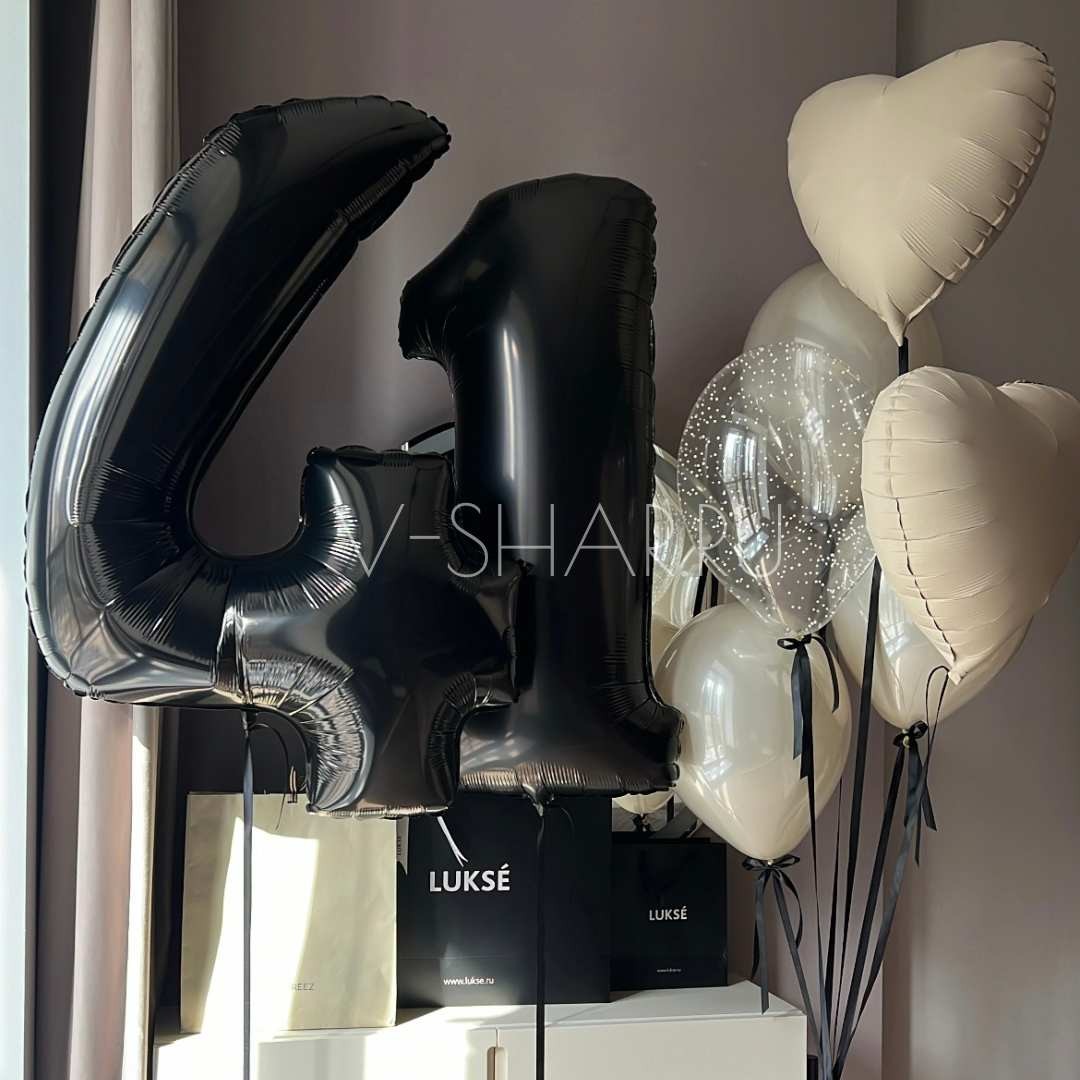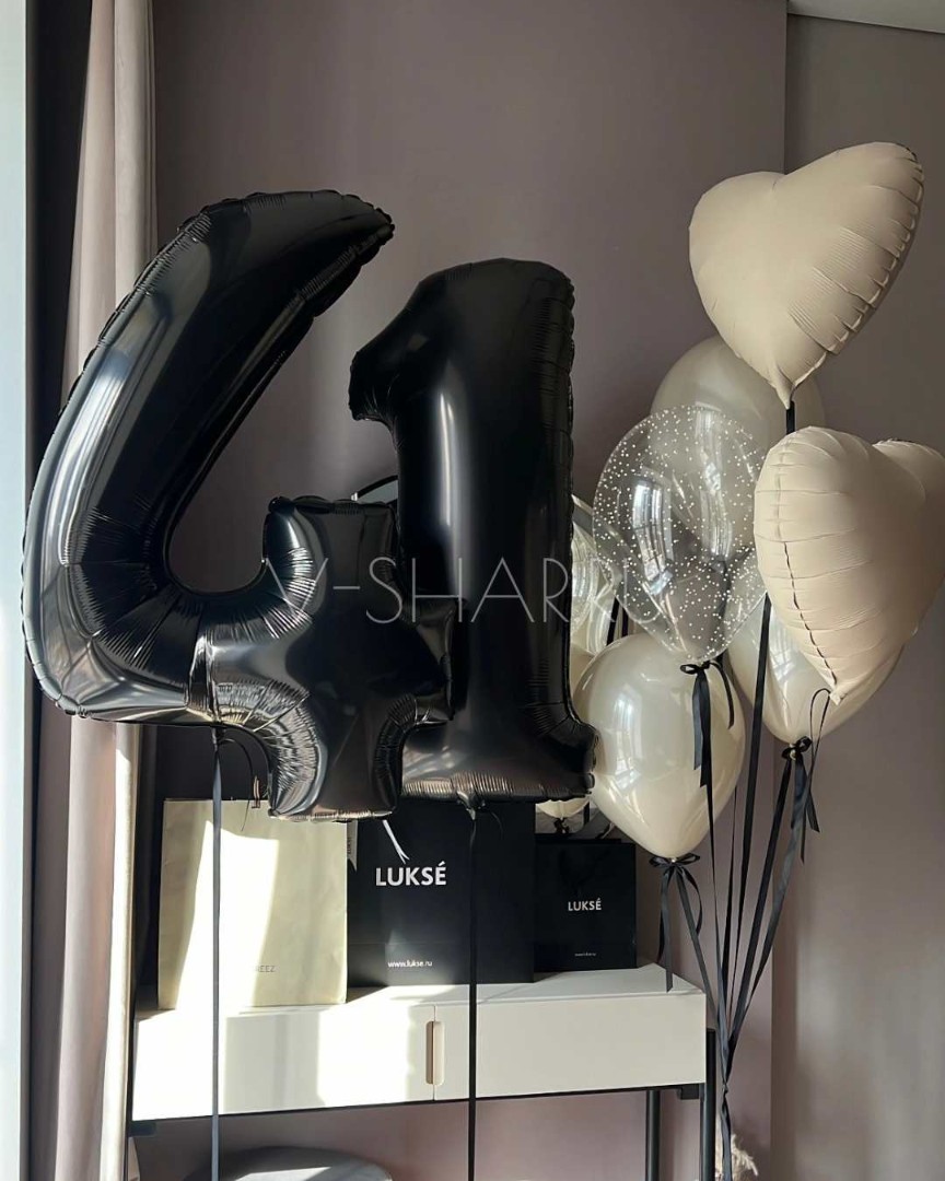 Стильная композиция из 8 шаров с гелием в двух оттенках чрный и крем на атласных черных лентах. Мы использовали в композиции шары цифры в черном лаковом оттенке, стильные даблы и шары с белым пенопластом. Этот набор по настоящему стильный и оригинальный, необычное сочетание удивит именинника. Ценители стиля оценят его по достоинству.