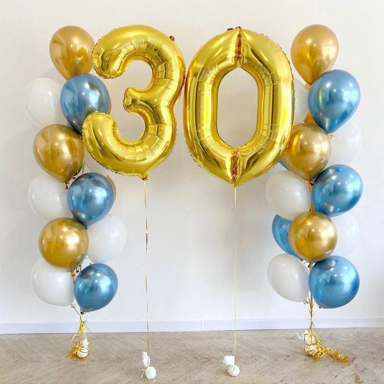 - 32 латексных шара 30-35 см (10 хром синий, 12 хром золотой, 10 пастель белый)
