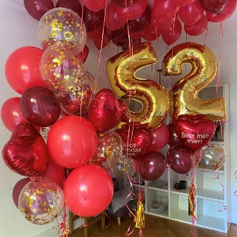 - два фонатна с цифрами (цифра, сердце с надписью, 2 кристалл бордовый, 1 шар с конфетти , 2 красный)