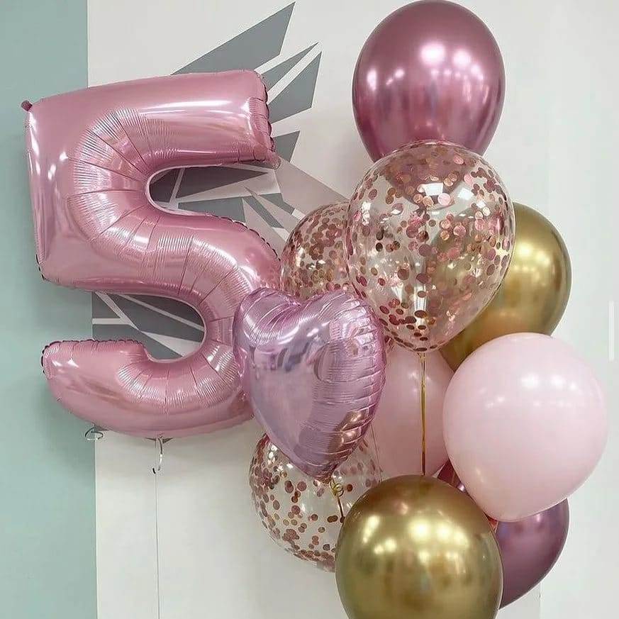 - фонтан из 10 шаров (сердце нежно-розовое, 2 шара E хром pink , 2 шара E хром gold, 2 шара B розовый макарун Soft Pink, 3 шара с конфетти розовое золото круги)