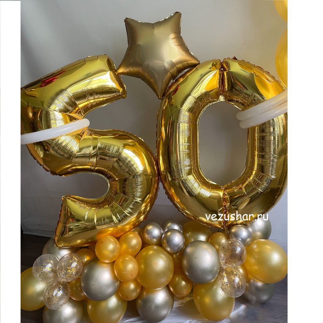 В составке композиции шары: 5д золото хром, металл, с конфетти, 10 и 12д золото хром и металл, ШДМ белые, фольгированная звезда золото сатин, цифры 102 см фольгированные золото на выбор (укажите число в комментарии к заказу)
