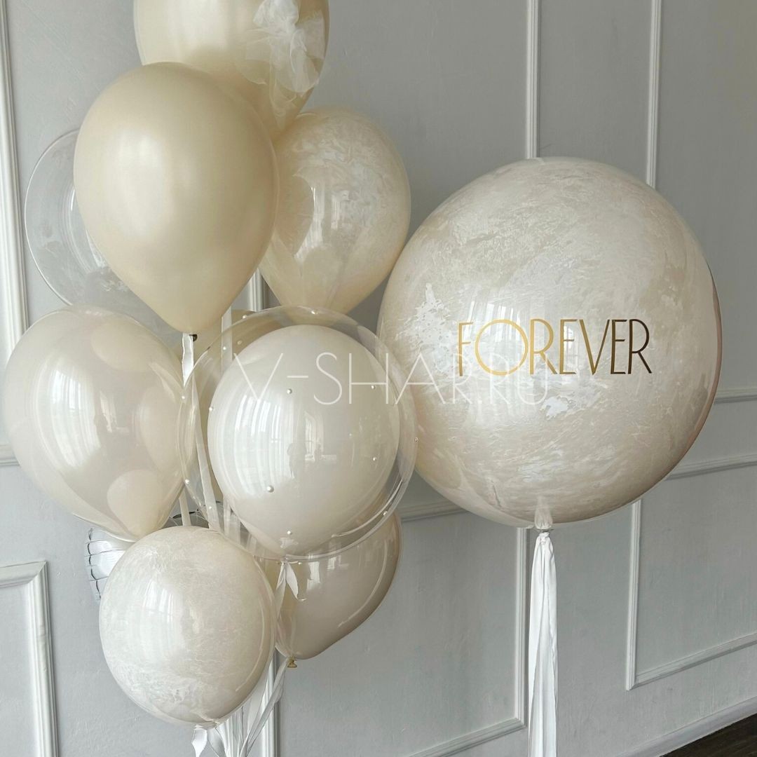 - 7 латексных шаров 30-35 см (2 белый песок, 1 белый песок с декором, 2 двойных кремовый в прозрачном кристале, 2 двойных кремовый в прозрачном кристале с белой краской)