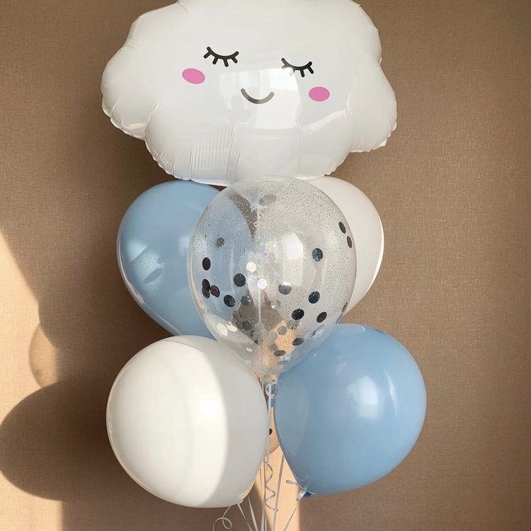 - 6 шаров (2 белых пастель, 2 голубых пастель, 2 с конфетти микс серебро мелкое и круг крупный)
