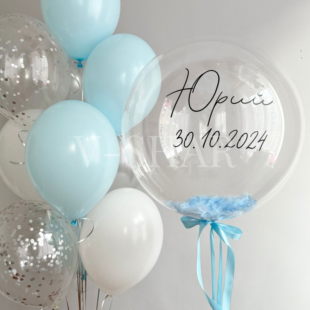 - 10 латексных шаров 30-35 см (2 хром серебро, 2 белый, 4 голубой макарунс, 2 с конфетти серебро)