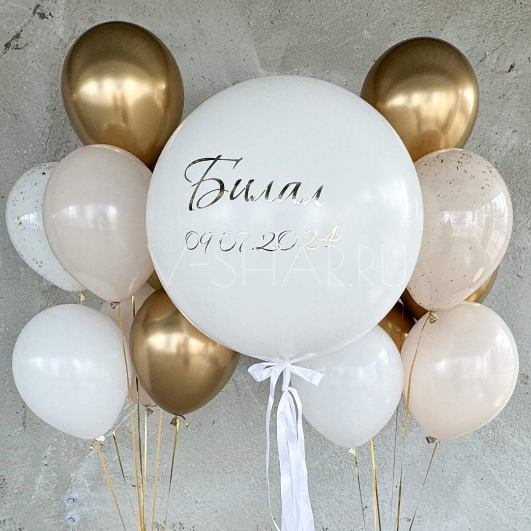 - 14 латексных шаров 30-35 см (3 белый, 3 белый песок, 6 золото хром, 2 двойной кристалл внутри белый/ белый песок с конфетти крошка золото)