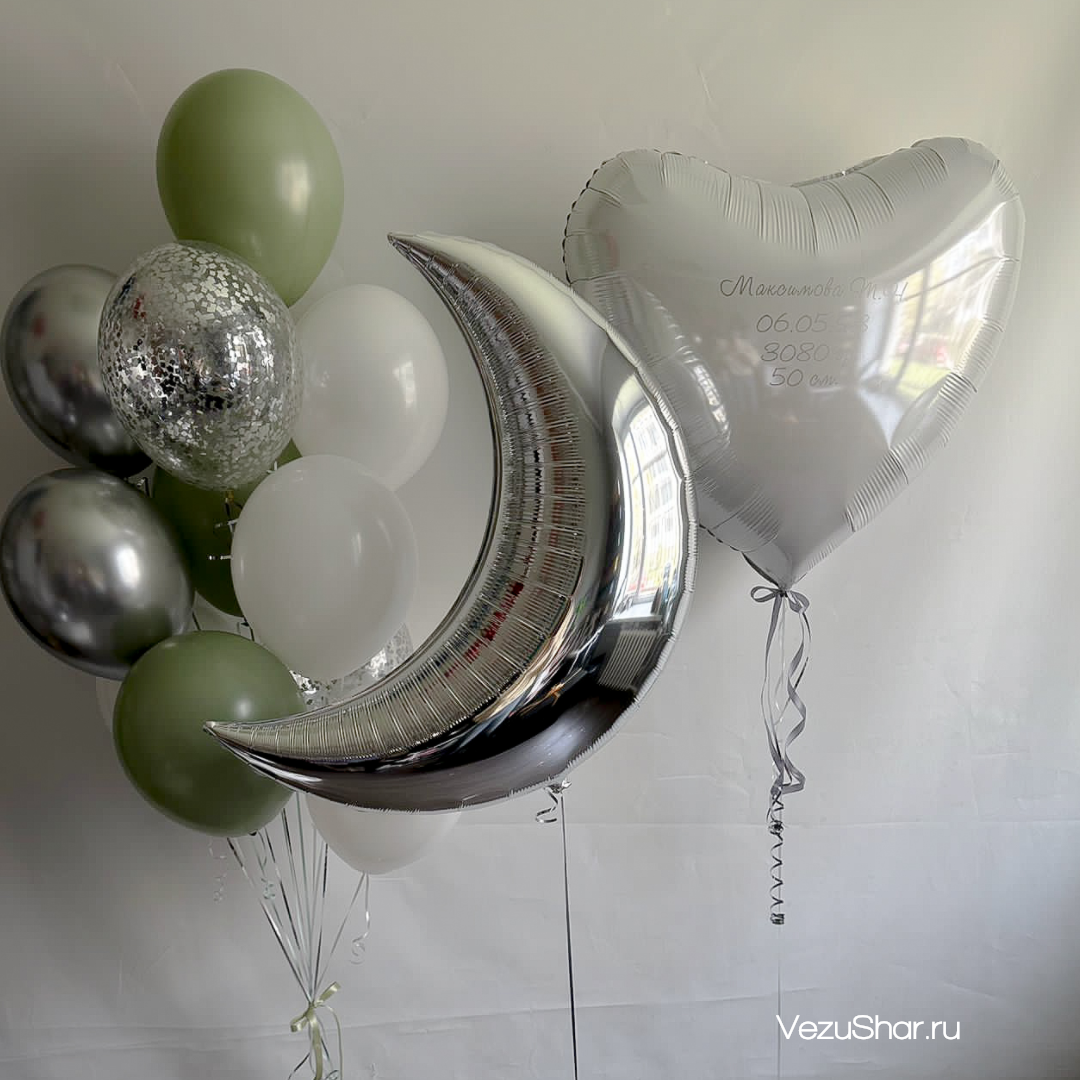 - фонтан из 10 шаров (2 шара с конфетти, 2 хром серебро, 3 шара эвкалипт, 3 шара белых)