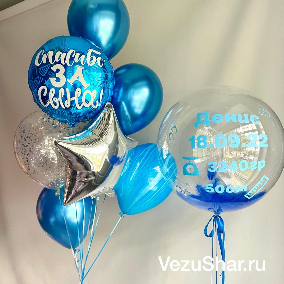 - фонтан из 9 шаров: 2 с конфетти, агат, звезда, круг с надписью, 4 шара хром синий.