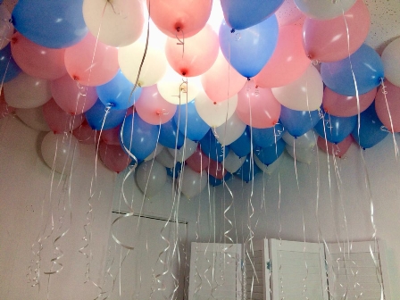 Мы приложили фото, на котором 70 шаров белого, голубого и розового цвета, и это выглядит впечатляюще. Тут все зависит от бюджета и ваших пожеланий.