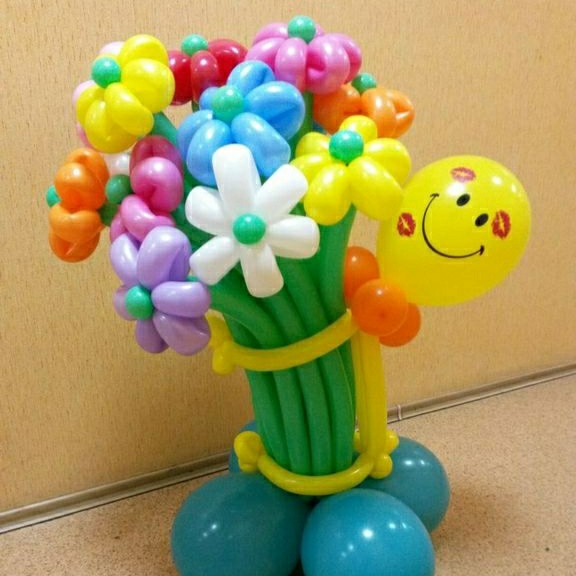 Милые зайчики и улыбающиеся человечки с букетом разноцветных ромашек, яркое желтое солнышко, облако шаров в палитре весенних красок создают вам настроение весны, солнечных дней, ярких впечатлений, любви и жизни.